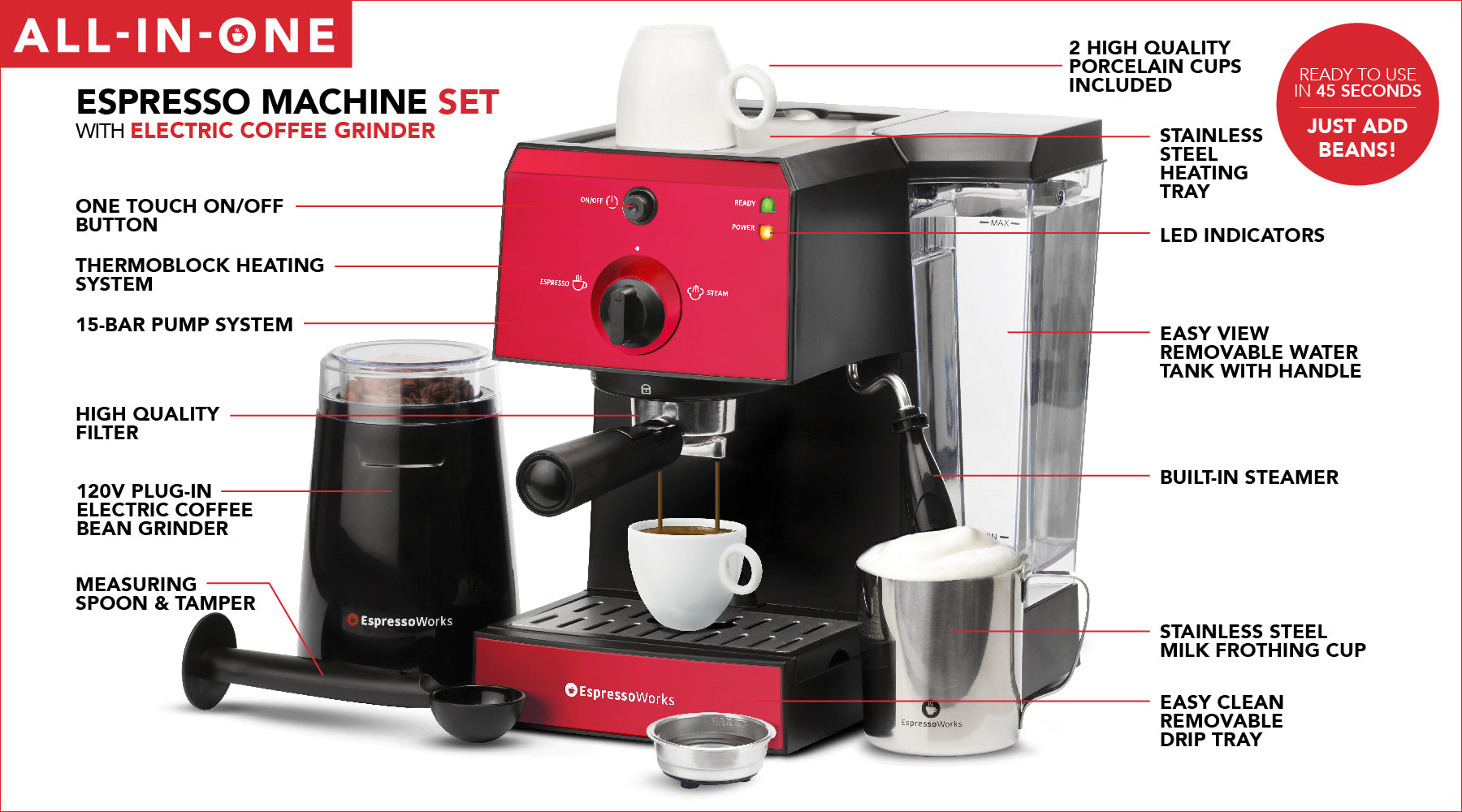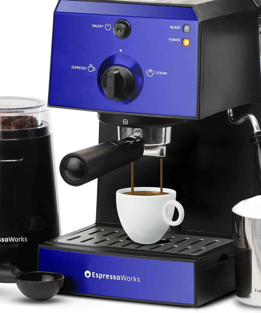 The EspressoWorks 15-bar Espresso Machine is more than just that, it’s the complete package! Including an Electric Grinder for coffee beans, Tamper and Measuring Spoon, 2 Premium Ceramic Cups, Portafilter, Single and Double Shot Baskets, and Milk Frothing Jug – it’s everything you need to be your own barista and personalize your coffee to your liking.